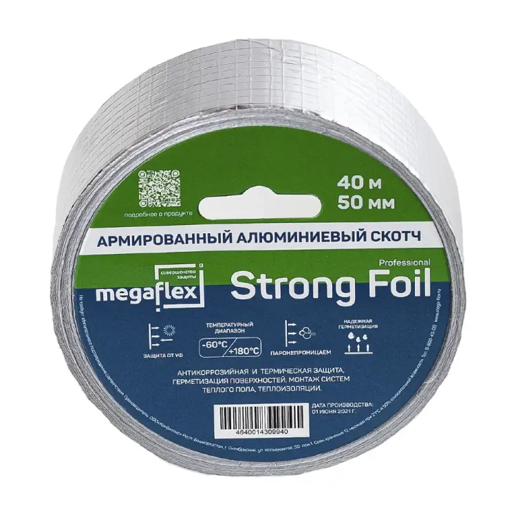 Армированная алюминиевая клейкая лента Megaflex strong foil 50 мм, 40 м MEGST.50.40 является композитным материалом и состоит из следующих материалов: ламинат фольги с полимерной плёнкой, армированный стеклосеткой и силиконизированная бумага в качестве разделителя (лайнера).Обладает отличными тепло-, влаго- и светоотражающими свойствами.В отличие от обычной алюминиевой клейкой ленты обладает повышенной прочностью. Благодаря синтетическим волокнам и дополнительному слою специальной бумаги способна выдерживать большие механические нагрузки. Отражает тепло, защищает от коррозии. Благодаря полипропиленовой основе с алюминиевым напылением, лента эффективно отражает свет и тепло, дает надежную защиту от коррозии. Повышенная устойчивость к экстремальным температурам. Основа ленты и ее клеевой слой позволяют сохранять ей свои свойства от -60… +180 (±5) градусов по Цельсию. Крайне высокая прочность на разрыв. Благодаря армированию сеткой из стеклоткани обладает высокой прочностью на разрыв. Высокая клейкость. Клеевой слой на основе синтетического каучука позволяет добиться максимальной адгезии. Качественная алюминиевая основа. Мы используем основу из алюминиевой фольги, что наделяет нашу ленту самыми высокими пользовательскими свойствами. Разделитель из силиконовой бумаги. Разделитель из специальной силиконовой бумаги позволяет отмерять ленту необходимой длины и лишь затем снимать силиконовый разделитель для непосредственного использования.