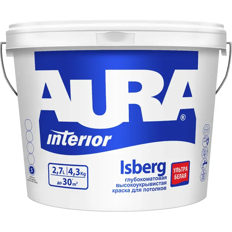 Краска Aura Isberg 2,7 л K0067 для потолков в сухих помещениях. Покрытие отличается исключительной белизной. Наносится как на неокрашенные, так и на окрашенные водно-дисперсионными красками минеральные поверхности: бетон, газобетон, асбоцемент, штукатурка, шпатлевка, кирпичная кладка, а также на поверхности, оклеенные различными рулонными отделочными материалами. В составе средства не содержится летучих органических растворителей.