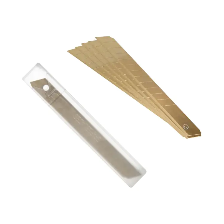 Набор запасных сегментированных лезвий Attache Selection с титановым покрытием, в10 раз долговечнее, чем обычные. Используются для резки широкого спектра материалов: напольных покрытий, ткани, бумаги, кожи, пленки и т. п. Особенности изделия: —Лезвия из инструментальной углеродистой стали с титановым покрытием —Подходят для ножей шириной 9,0мм —Лезвия изготовлены с технологией лазерной заточки, позволяющей создавать ровную и прочную режущую кромку —Не подвержены коррозии —В комплекте 5 шт. Характеристики изделия: —Ширина лезвия 9,0мм —Толщина лезвия 0,4мм —Количество рабочих сегментов 13 шт. Меры предосторожности: —При работе с лезвиями используйте средства защиты —Не утилизируйте лезвия сбытовыми отходами —Хранить в недоступном для детей месте