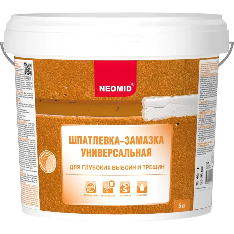Neomid Шпатлевка для выбоин и трещин /5 кг/ ЭЭ Н-Шпат-трещ/5, безусадочная готовая к применению шпатлевка на акриловой основе предназначена для заделки глубоких выбоин, щелей и трещин при проведении ремонтных работ снаружи и внутри помещений. Обладает высокой адгезией к любым видам строительных оснований. Входящие в состав армирующие микроволокна позволяют заполнять выбоины и трещины глубиной до 5 см без растрескивания. Устойчива к воздействию влаги. Пластична и удобна в работе. Экологически безопасна, не содержит токсичных компонентов.