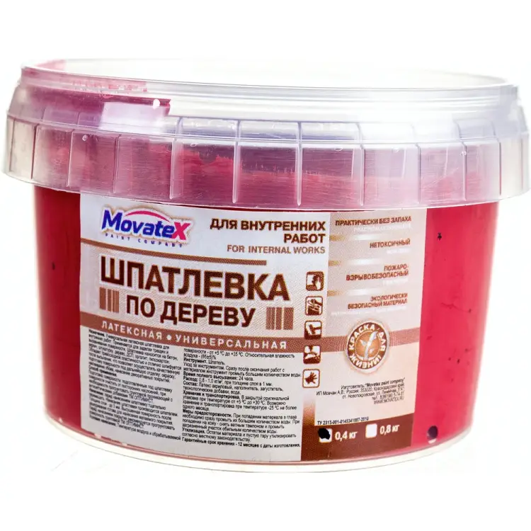 Шпаклевка по дереву (0.4 кг; махагон) Movatex Т16166 предназначена для внутренних работ. Используется для заделки трещин и выравнивания поверхности. Подходит для нанесения на бетон, кирпич, штукатурку, дерево, ДСП, оргалит, гипсокартон. Имеет превосходную пластичность и отлично шлифуется после высыхания, что позволяет осуществлять качественную подготовку поверхности под дальнейшую отделку: окраску, наклеивание обоев, нанесение декоративных покрытий.