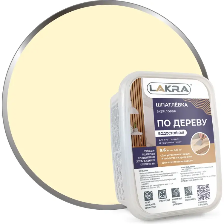 Шпатлевка по дереву Береза 0,6 кг Лакра 90000309205 используется для выравнивания дефектов на любых деревянных поверхностях, в том числе и паркета. Ассортимент цветов позволяет подобрать оптимальный. Кроме того, шпатлевку можно смешивать с колерами на водной основе. Легко наносится и шлифуется. Правила использования. Очистить поверхности от грязи, краски. Нанести шпатлевку слоем не более 1 мм. Следующие слои наносить только после полного высыхания предыдущих. Отшлифовать готовую поверхность. Важно! Работать со шпатлевкой при температуре не ниже 12°С и влажности воздуха не более 80%.