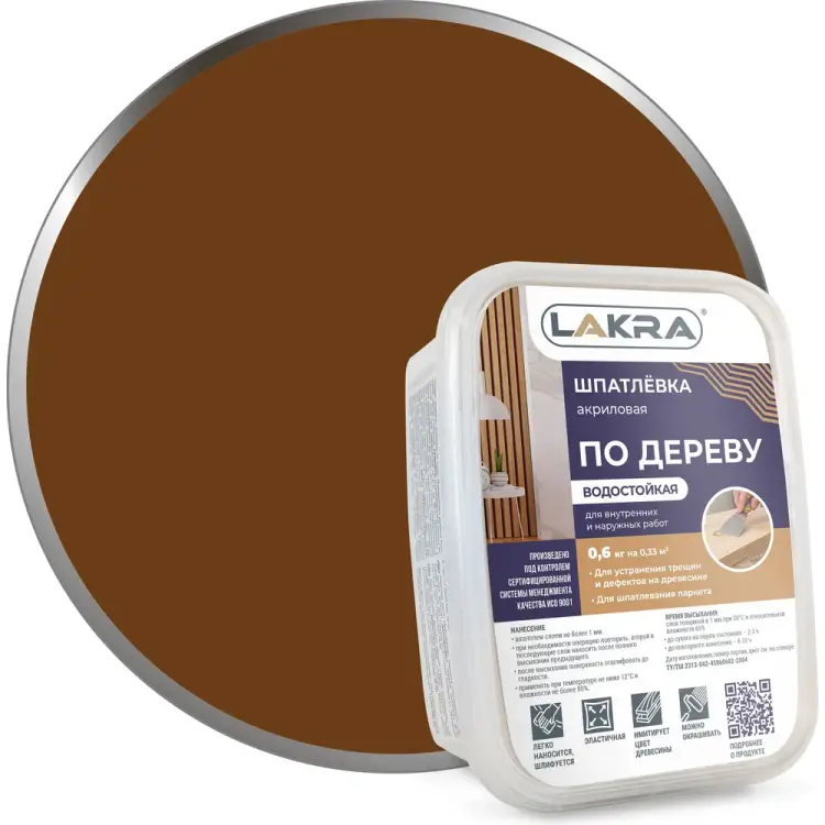 Шпатлевка по дереву Орех 0,6 кг Лакра 90001110173 используется для выравнивания дефектов на любых деревянных поверхностях, в том числе и паркета. Ассортимент цветов позволяет подобрать оптимальный. Кроме того, шпатлевку можно смешивать с колерами на водной основе. Легко наносится и шлифуется. Правила использования. Очистить поверхности от грязи, краски. Нанести шпатлевку слоем не более 1 мм. Следующие слои наносить только после полного высыхания предыдущих. Отшлифовать готовую поверхность. Важно! Работать со шпатлевкой при температуре не ниже 12°С и влажности воздуха не более 80%.