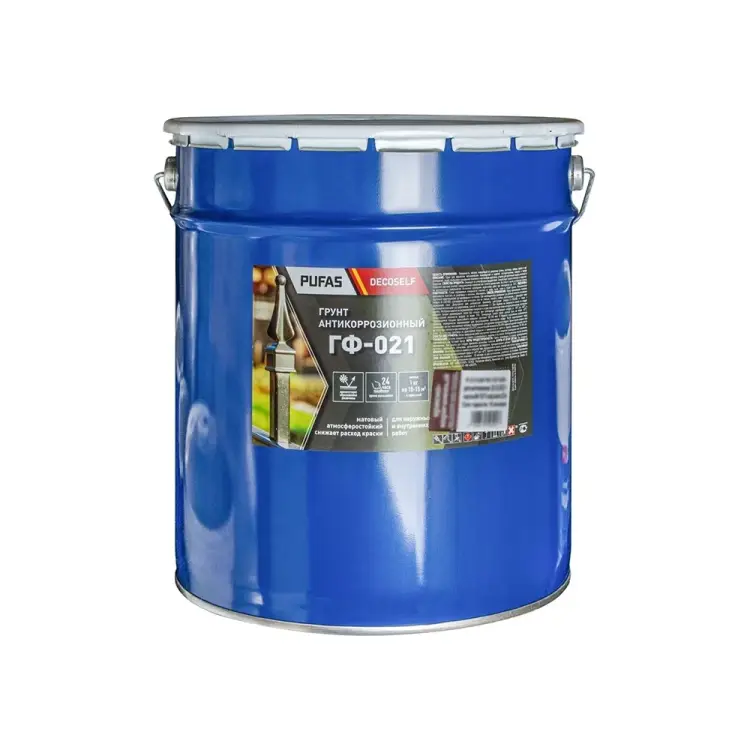 Грунт Pufas ГФ-021 предназначен для грунтования металлических, деревянных (включая ДСП) и оштукатуренных поверхностей под покрытие алкидными эмалями и масляными красками. Продукт представляет собой суспензию противокоррозионного пигмента и наполнителей в алкидном лаке с добавлением растворителя, сиккатива, стабилизирующих веществ. Препятствует образованию коррозии на металле. Рекомендована для ответственных металлоконструкций.