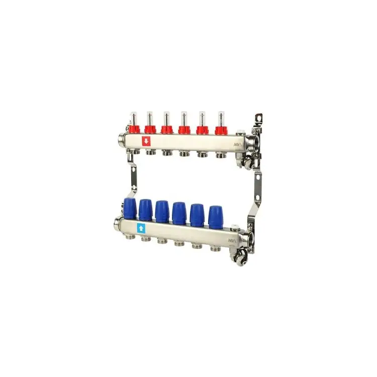 Коллектор MVI из нержавеющей стали в сборе с расходомерами, дренажным краном и воздухоотводчиком MS.706.06 предназначен для распределения потока рабочей среды систем водяного отопления по потребителям. При этом под «потребителем» понимается отдельный нагревательный прибор или группа приборов, контур или петля «теплого пола», отдельные части или ветви системы. Коллекторный блок объединяет в себе подающий и обратный коллекторы из нержавеющей стали, запорные клапаны, термостатические клапаны (с возможностью установки электротермического сервопривода) и крепежные кронштейны. Присоединение циркуляционных петель осуществляется с помощью фитингов стандарта «евроконус» 3/4" (НР).