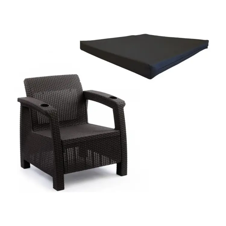 Кресло произведено из высококачественного полипропилена, имитирующего плетение из ротанга. Кресло имеет одно посадочное место, допустимая нагрузка на одно посадочное место - 106 кг. На подлокотниках дивана расположены отверстия для напитков. Кресло может стать идеальным решением по оформлению зоны отдыха в доме, на садовом участке, в офисном помещении или в кафе. Благодаря цветовым решениям, кресло подойдет под любой интерьер. Кресло упаковывается в индивидуальную упаковку, инструкция по сборке прилагается. Зону отдыха также можно дополнить журнальным столиком и диванами серии «Ротанг». Подушки черного цвета для сидения в комплекте выполнены из прочного и водоотталкивающего материала Оксфорд 600. Мебель предназначена для использования внутри и снаружи помещения.