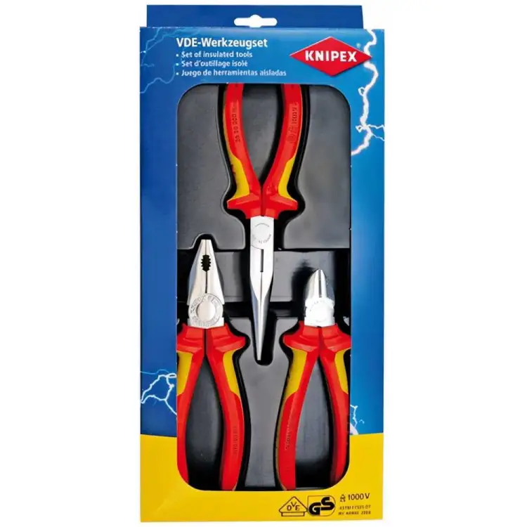 Набор электроизолированных инструментов KNIPEX KN-002012 состоит из трех предметов расположенных в пластиковом блоке. Инструмент предназначен для выполнения таких задач, как захват и удержание деталей, резка и сгибание проволоки различной степени жесткости. Рукоятки оснащены диэлектрическими чехлами, что позволяет безопасно работать на электрооборудовании под напряжением до 1000 В переменного и 1500 В постоянного тока.