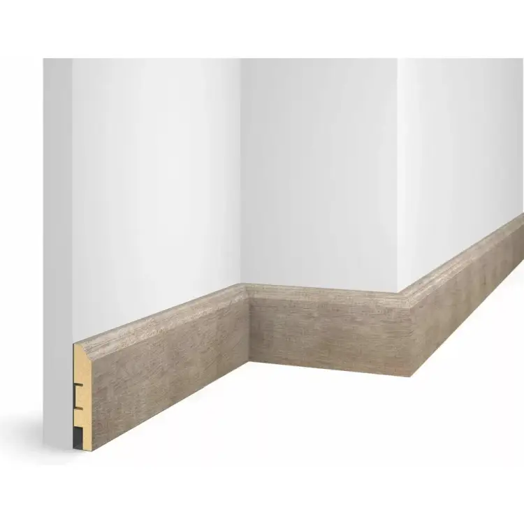 Плинтус COSCA DECOR WP07 экошпон, дуб серо-коричневый, 80x16x2400 мм, МДФ СПБ103725 выполнен из MDF (древесное волокно с добавлением лигнина и парафина) с декоративным покрытием экошпон. Технология производства плит MDF улучшает свойства простого дерева, такие как влагостойкость, однородная прочная структуру, не коробится. Особенности производства покрытия, позволили создавать тиснение, которое максимально приближено к натуральному шпону, с визуальными и тактильными ощущениями близкими к натуральной древесине. В составе покрытия многослойная, высококачественная бумага, сочетающая от четырех до шести цветовых оттенков в одном декоре, что дает ощущение перелива и мягкости цвета. Верхний слой покрытия - защитный лак, нанесенный по технологии электронно-лучевого отверждения, что обеспечивают высокую эксплуатационную устойчивость декоративного покрытия.