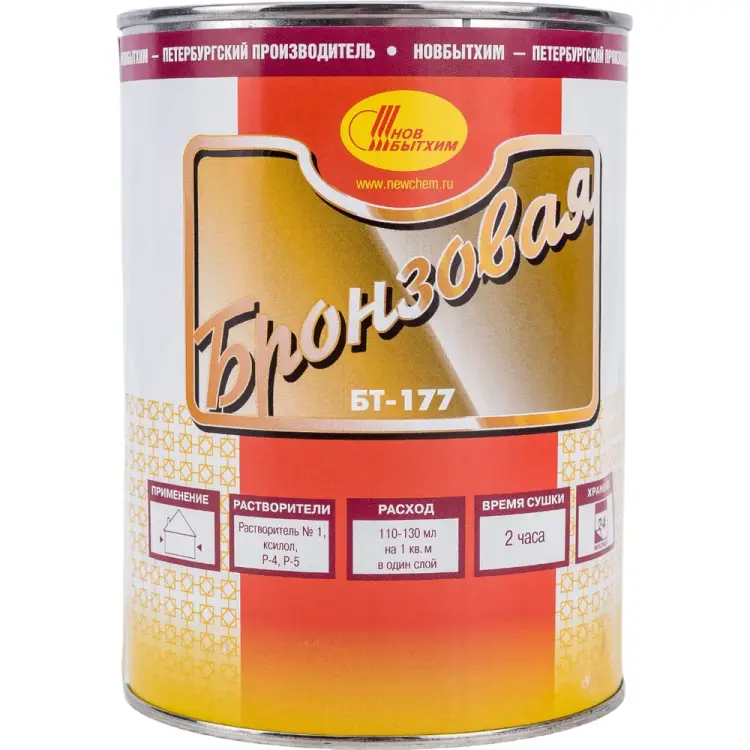 Краска НОВБЫТХИМ БТ-177 Бронзовая банка 1 л 64 защищает и окрашивает металлические конструкции и изделия, эксплуатирующиеся в атмосферных условиях. Область применения. Защитная окраска для металлических и бетонных конструкций, эксплуатирующихся в атмосферных условиях. Ограничения: Непригодны для окраски внутренних поверхностей емкостей для сбора и хранения воды, а также для окраски металлических поверхностей, нагревающихся свыше +90 °С Не рекомендуется наносить на поверхности, окрашенные масляными или алкидными (ПФ и ГФ) красками или эмалями, ввиду плохой адгезии к указанным поверхностям При нанесении на поверхности, окрашенные нитроэмалями, может происходить вспучивание покрытия Рекомендуется наносить на предварительно подготовленные (загрунтованные, зашпаклеванные либо очищенные) металлические поверхности Состав: битум, синтетические смолы, функциональные добавки, алюминиевая пудра, перламутр и слюда (кроме "Серебрянки"), органические растворители