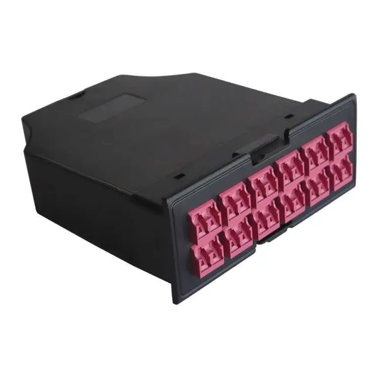 Кассета представляет собой пластмассовый корпус, в котором находятся две 12-волоконные сборки типа «гидра». С тыльной стороны кассеты находятся 12-волоконные разъемы МРО, с лицевой стороны кассеты – два ряда оптических разъемов duplex LC. Кассеты предназначены для установки в модульную панель LAN-FRM-PP-STP/1U. В панель можно установить до 4х кассет, таким образом обеспечивается плотность размещения 96 портов LC (48 duplex LC). В корпусах LC адаптеров предусмотрены встроенные пылезащитные шторки на лицевой стороне. Шторки автоматически утапливаются при подключении патч-корда. В закрытом положении, защищает внутреннее пространство от попадания пыли и грязи. Полярность: В Тип волокна: ОМ4 Вносимые потери (Insertion Loss): Разъем MPO ≤ 0,35dB Разъемы LC ≤ 0,30dB