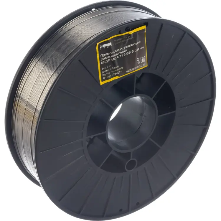Проволока MIG E71T-GS Кедр 7250004 предназначена для полуавтоматических сварочных аппаратов MIG/MAG. Имеет особое строение и выполнена в виде полого цилиндра, внутри которого находится специальный порошок. Порошок предотвращает попадание воздуха на металл, формирует и легирует шов и пр. Сварка проходит без использования газа.