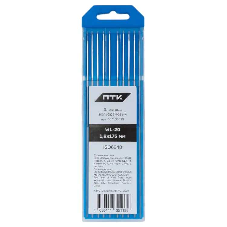 Вольфрамовый электрод под маркой WL-20 применяется при аргонодуговой сварке TIG на переменном (AC) и постоянном (DC) токе. Электрод используется для сварки алюминия, нержавеющей и углеродистой стали. Для повышения стойкости и улучшения качественных свойств электрод легирован оксидом лантана (La₂O₃). За счет увеличенного содержания этого элемента в составе (до 2,2%) электроды можно использовать для сварки на максимальных токах. Вольфрам марки WL-20 отличается легким поджигом дуги и обеспечивает сохранность заточки за счет равномерного распределения элемента по всей длине электрода. Лантановые электроды меньше загрязняют вольфрамом шов, что особенно важно при финишных сварных швах. Диаметр электрода 1,6 мм, длина электрода 175 мм. Вольфрам имеет синий цветовой код. Поставляется в пластиковом пенале по 10 штук.