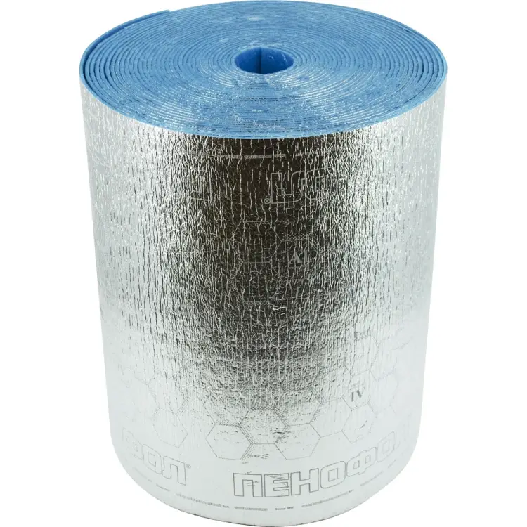 ПЕНОФОЛ 2000 тип с, 5 мм, 0.6х30 м, 18 кв. м С050630 применяется в качестве утеплителя снаружи и внутри помещений. Так же используется для изоляции воздуховодов, систем вентиляции и кондиционирования, климатических камер, холодильных установок, технологического оборудования, отопления, холодного и горячего водоснабжения. Самоклеящийся материал на основе вспененного полиэтилена, голубого цвета, с закрытой пористой структурой, дублированный алюминиевой фольгой с защитой от подделок - универсальной печатью с одной стороны и клеевым слоем с другой. Диапазон рабочих температур: от -60 до +60 градусов.